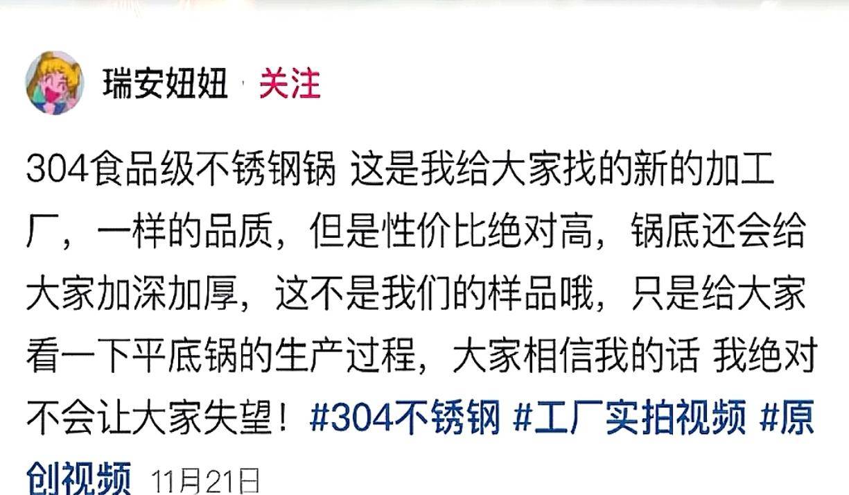 有细心网友比对“瑞安妞妞”所售锅具图片,发觉其手柄设想存正在缺陷,凹槽处易,不像正轨厂家出品。她虽利用304不锈钢,却一直未能出示检测演讲,而下单的消费者也迟迟未收到货色。