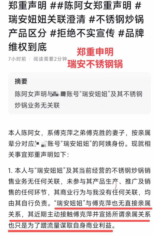 傅克萍的弟妇陈阿女也出头具名,暗示取“瑞安妞妞”并无任何营业往来,才恍然,这并非“亲戚内卷”,而是一场细心筹谋的流量。