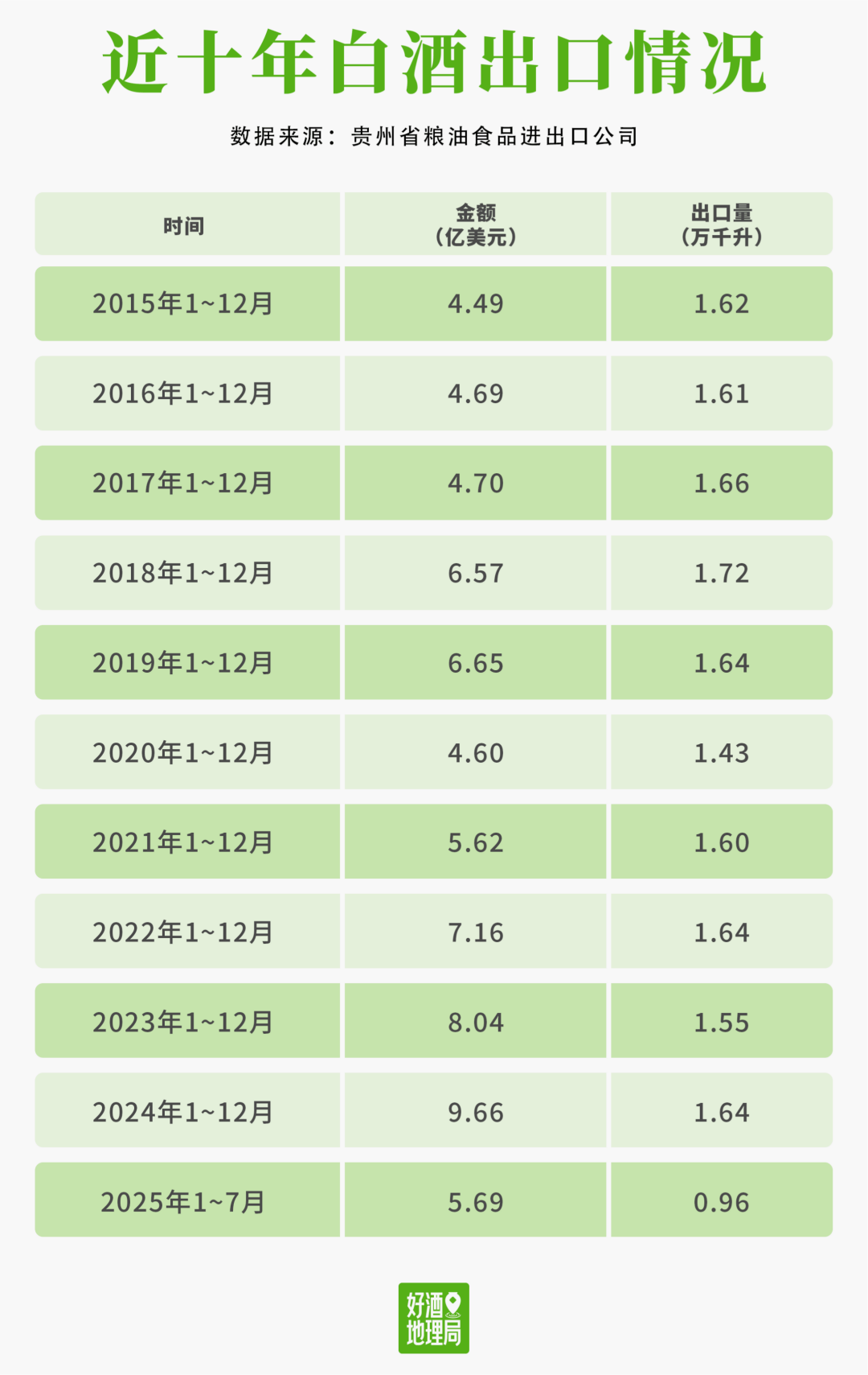 一个颇具意味的现象是:过去十年,一直盘桓正在1。6亿升摆布。但白酒出口额从2015年的4。49亿美元已翻至2024年的9。66亿美元。
